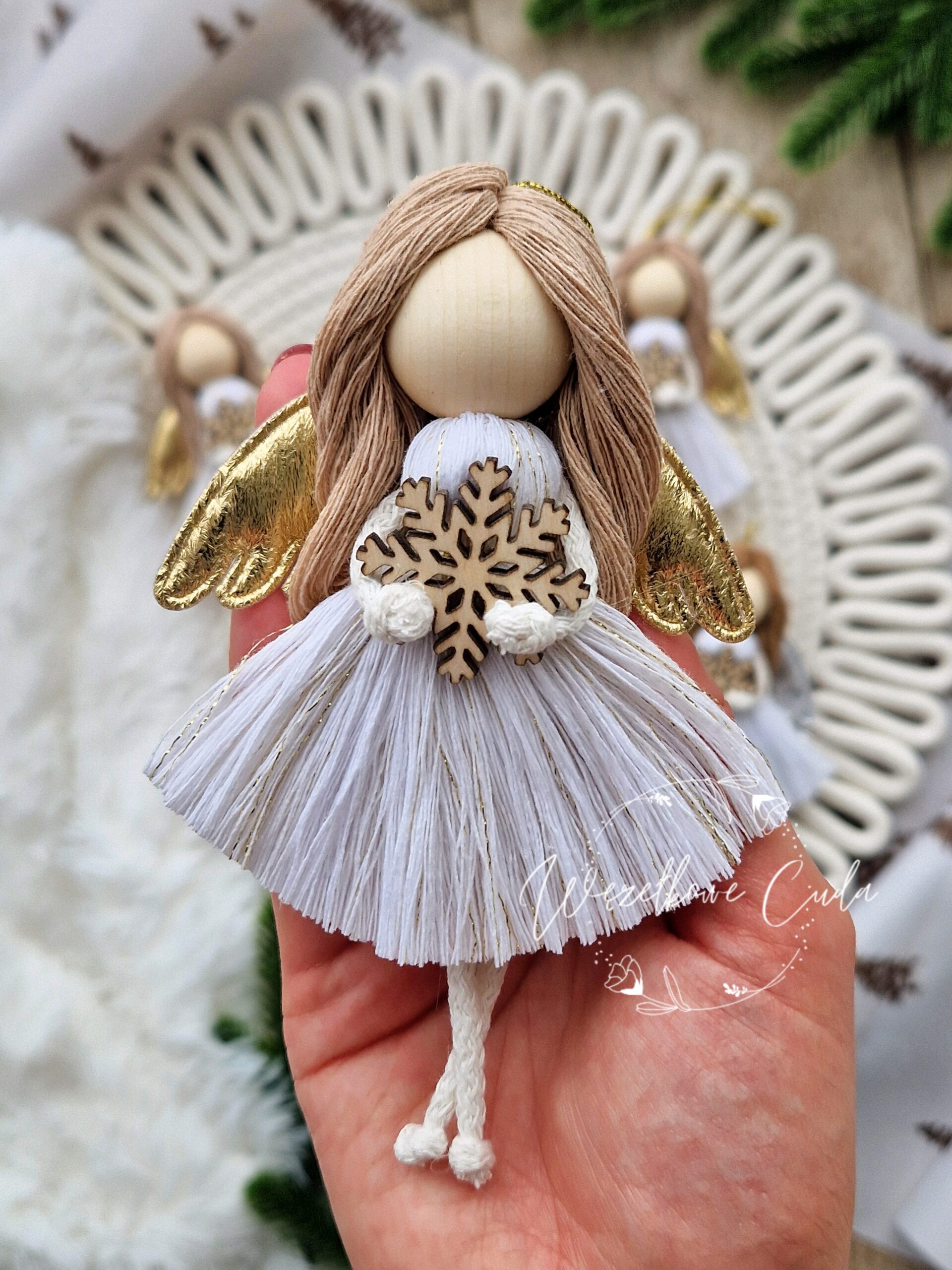 Prosty, a jednocześnie pełen uroku aniołek wykonany techniką makramy to idealna ozdoba na święta. Pleciony ręcznie z naturalnego sznurka, sprawdzi się jako zawieszka na choinkę, dodatek do prezentu lub dekoracja okienna.