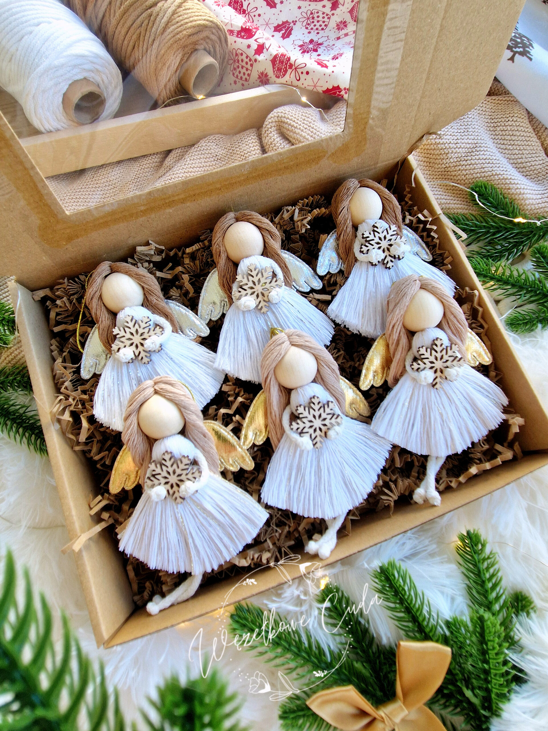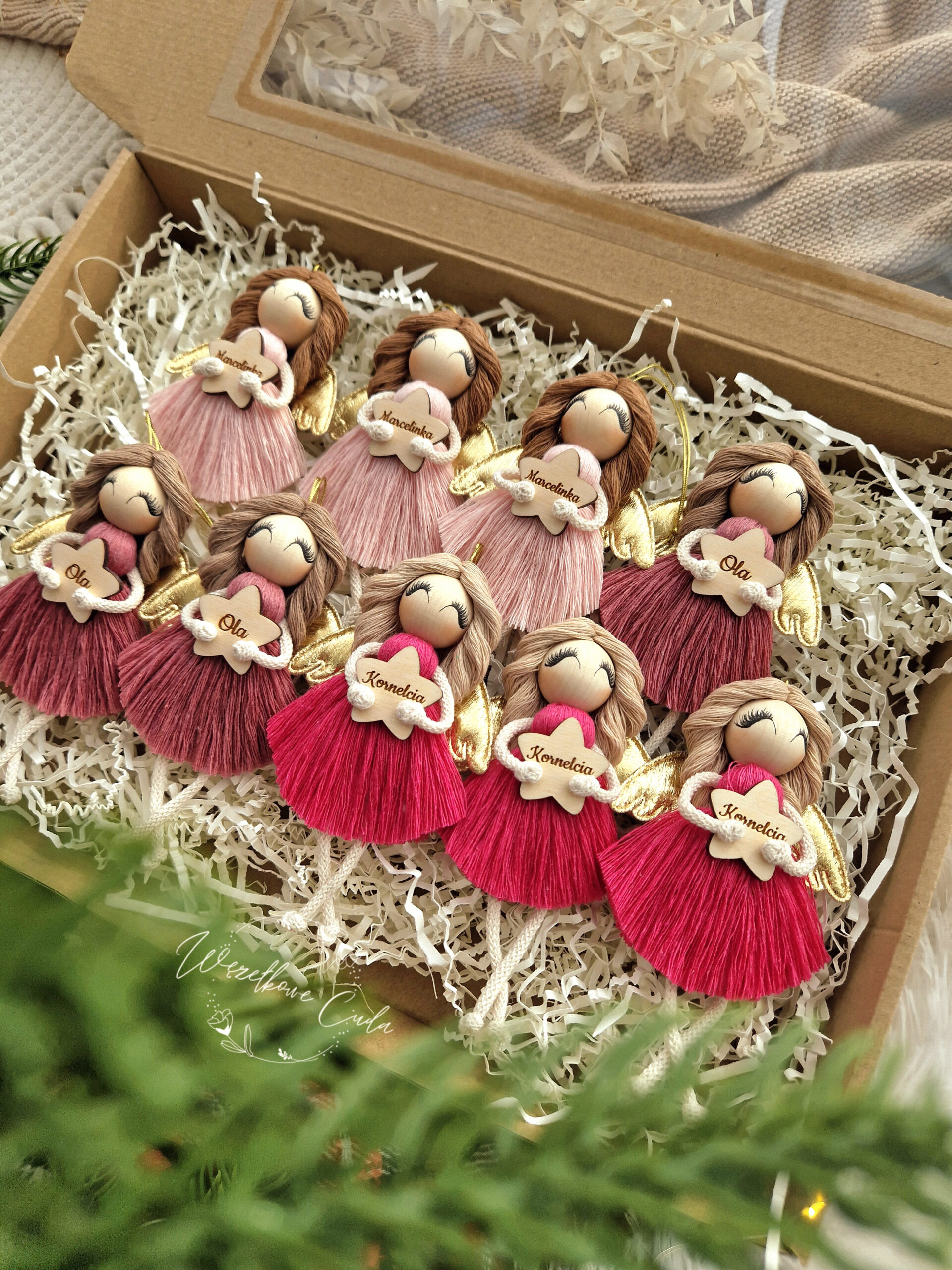 • Pakowanie na prezent – aniołek zapakowany w ozdobne pudełko z okienkiem, przewiązane dekoracyjną wstążką.