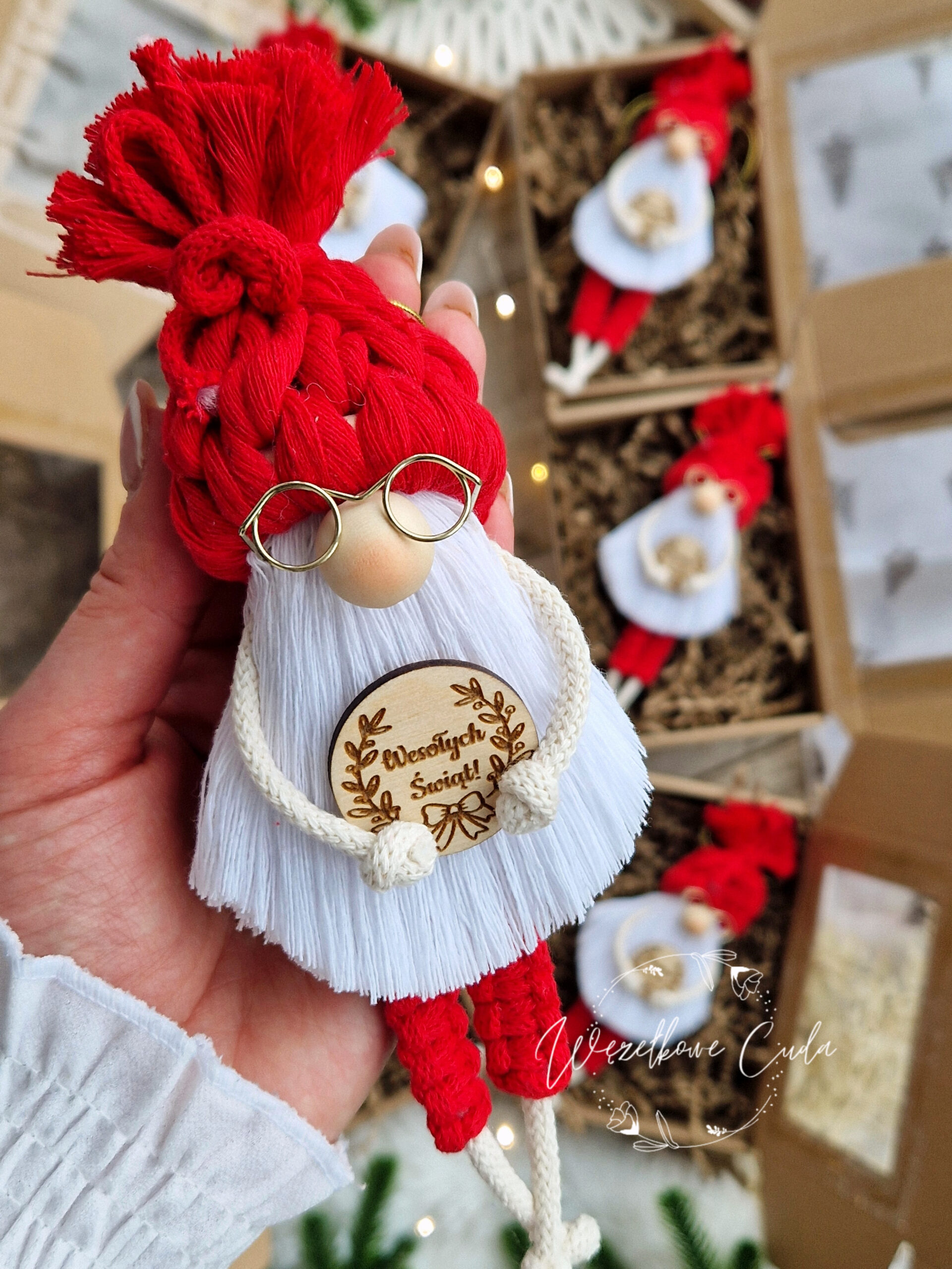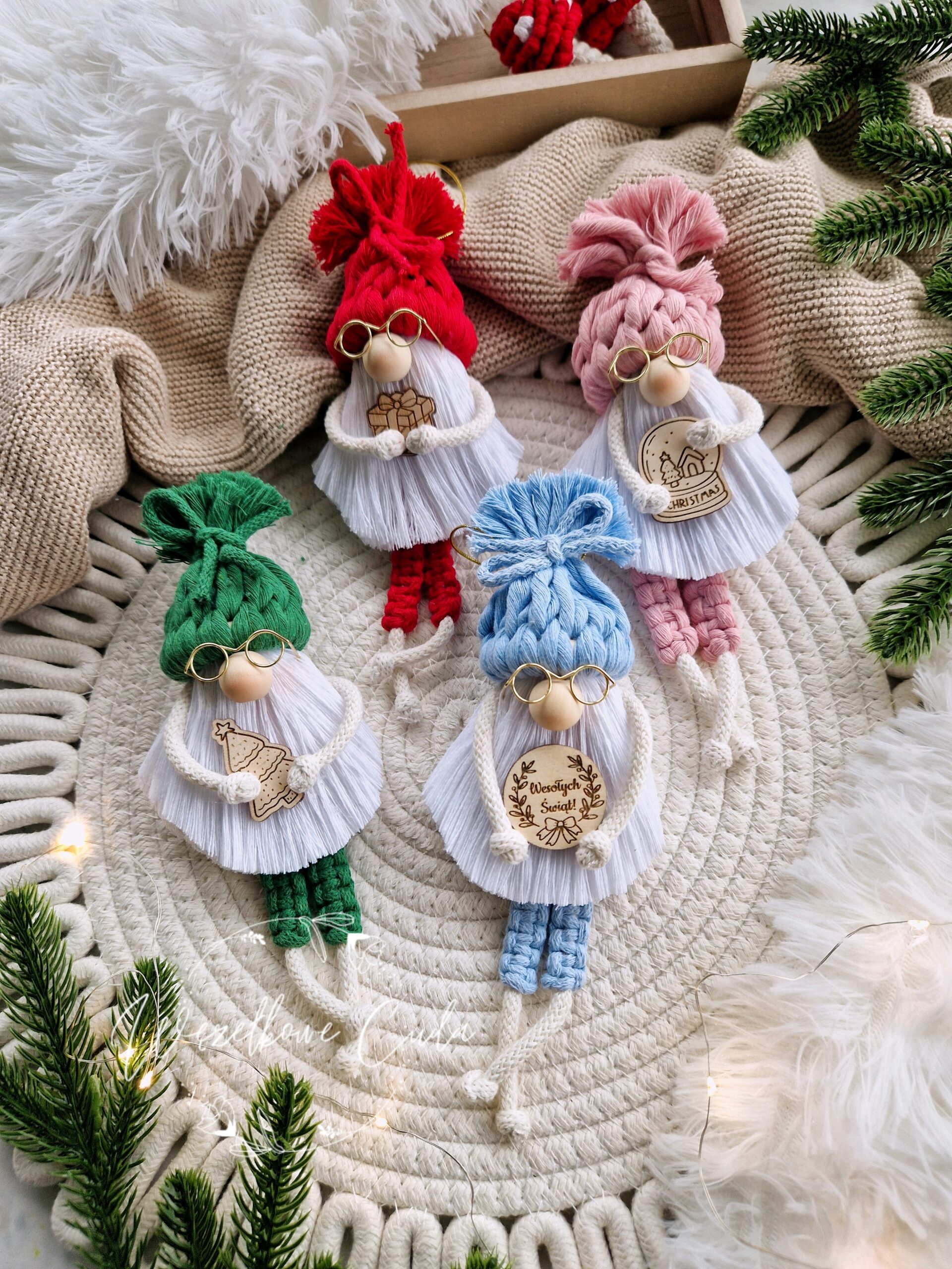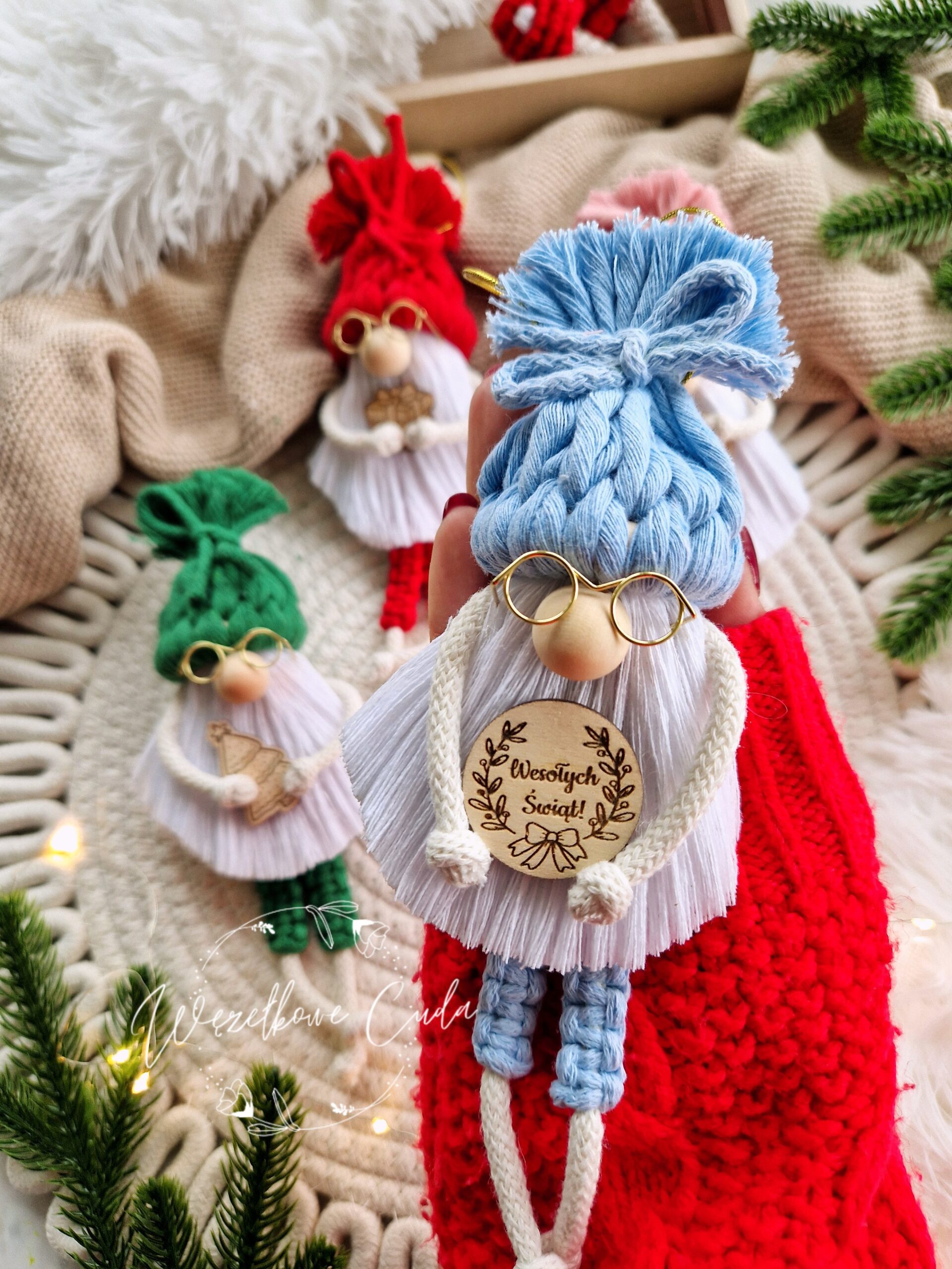 Niebanalna dekoracja, która łączy tradycję z nowoczesnym stylem boho. Te urocze skrzaty wykonane ręcznie z bawełnianego sznurka przyciągają uwagę starannością wykonania i ciepłym, świątecznym charakterem. Sprawdzą się jako ozdoba choinkowa, dekoracja wnętrza, zawieszka na prezent lub miły drobiazg dla kogoś bliskiego.