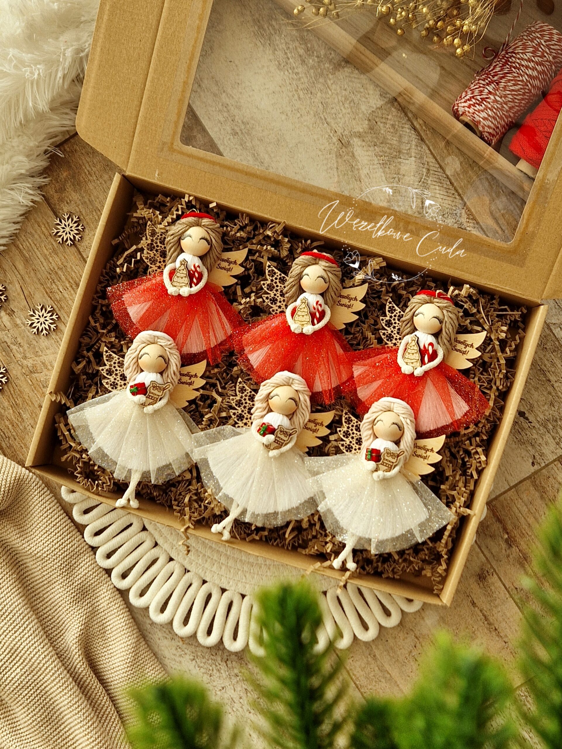 • Pakowanie na prezent – aniołki zapakowane w ozdobne pudełko z okienkiem, przewiązane dekoracyjną wstążką.