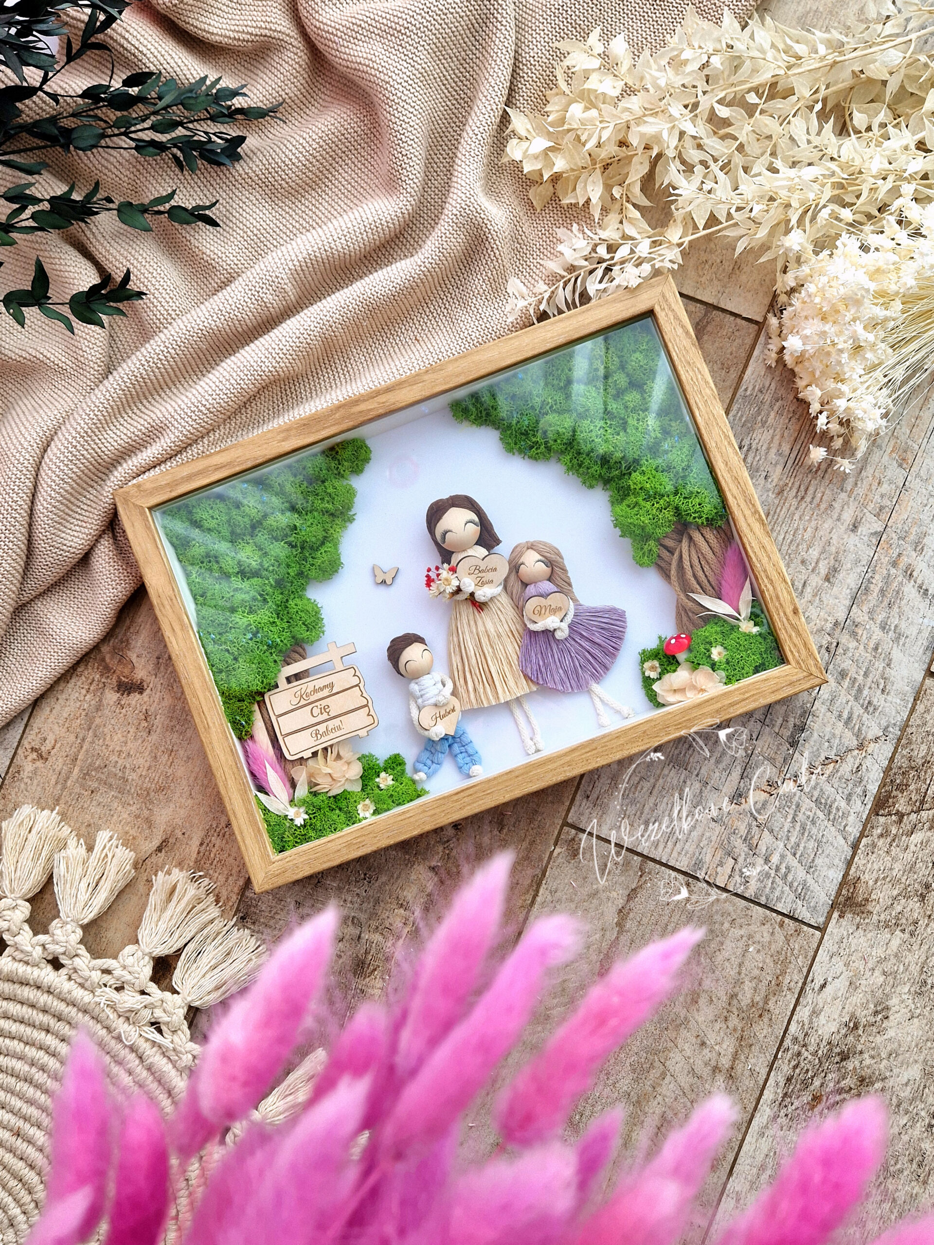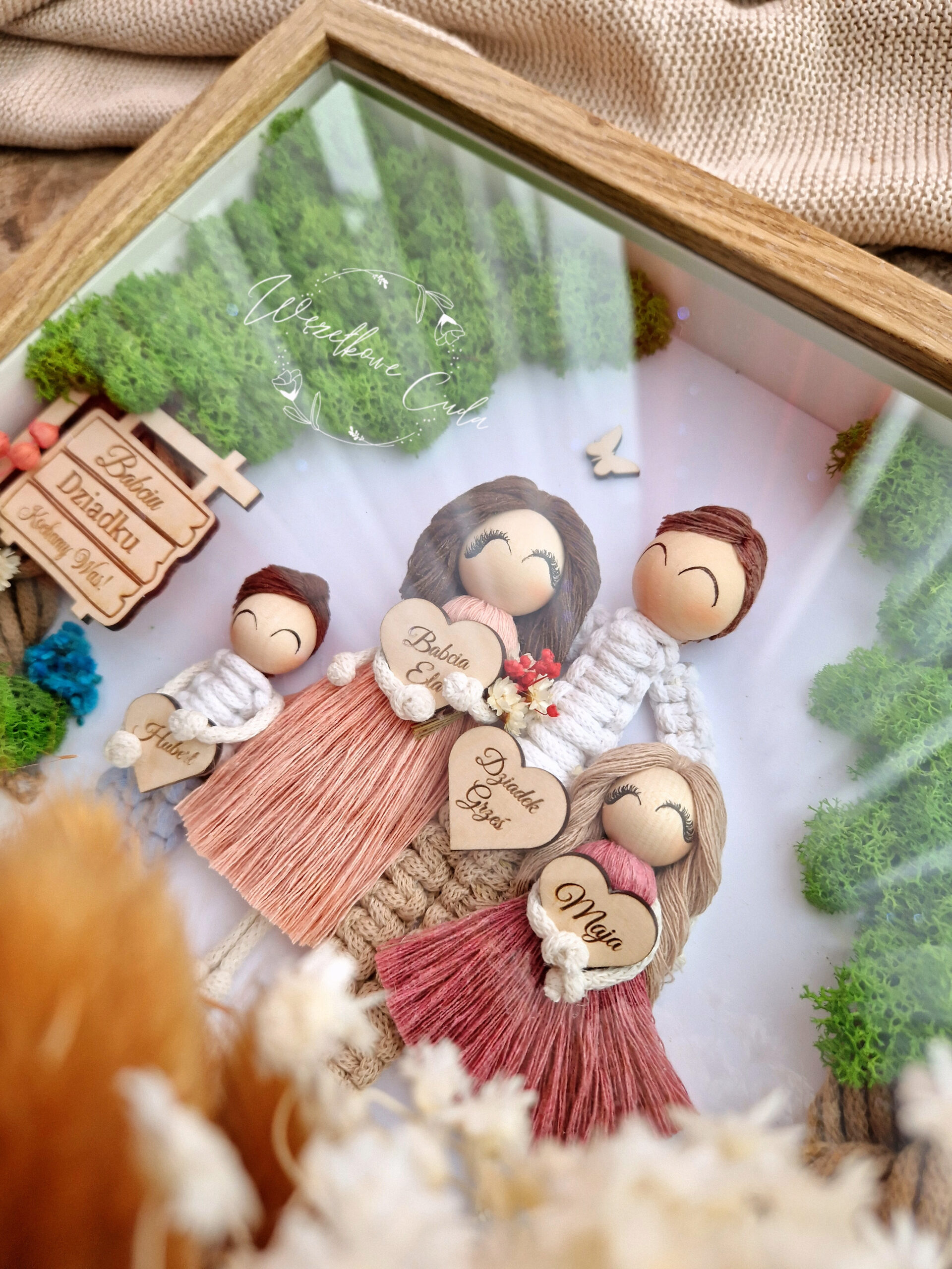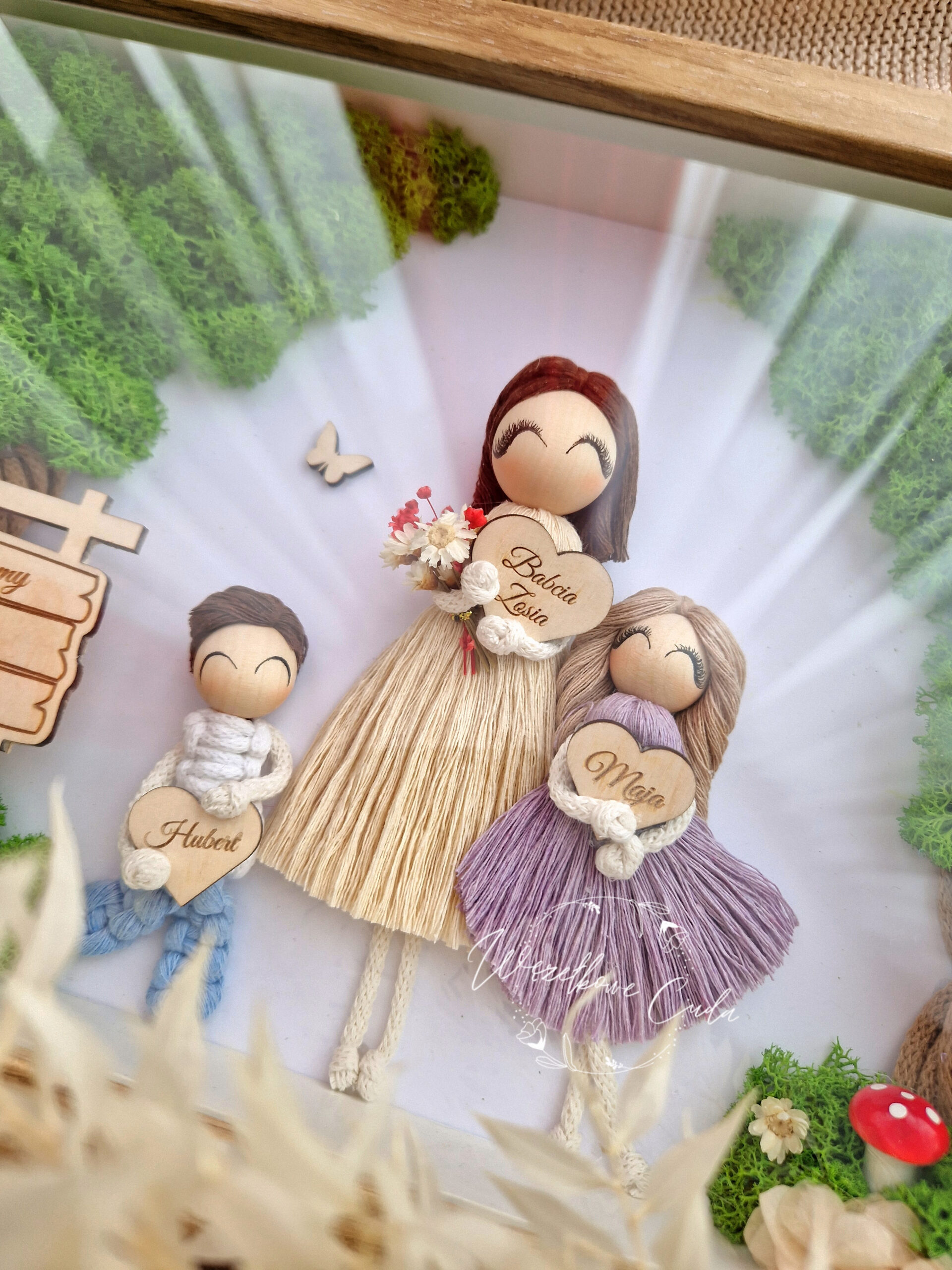 Wykonana z naturalnego drewna i ozdobiona delikatnymi figurkami z makramy, ramka przedstawia uroczy obrazek rodzinny. Każdy szczegół – od suszonych kwiatów po imiona umieszczone na drewnianych serduszkach – tworzy spersonalizowaną kompozycję pełną ciepła i uroku.