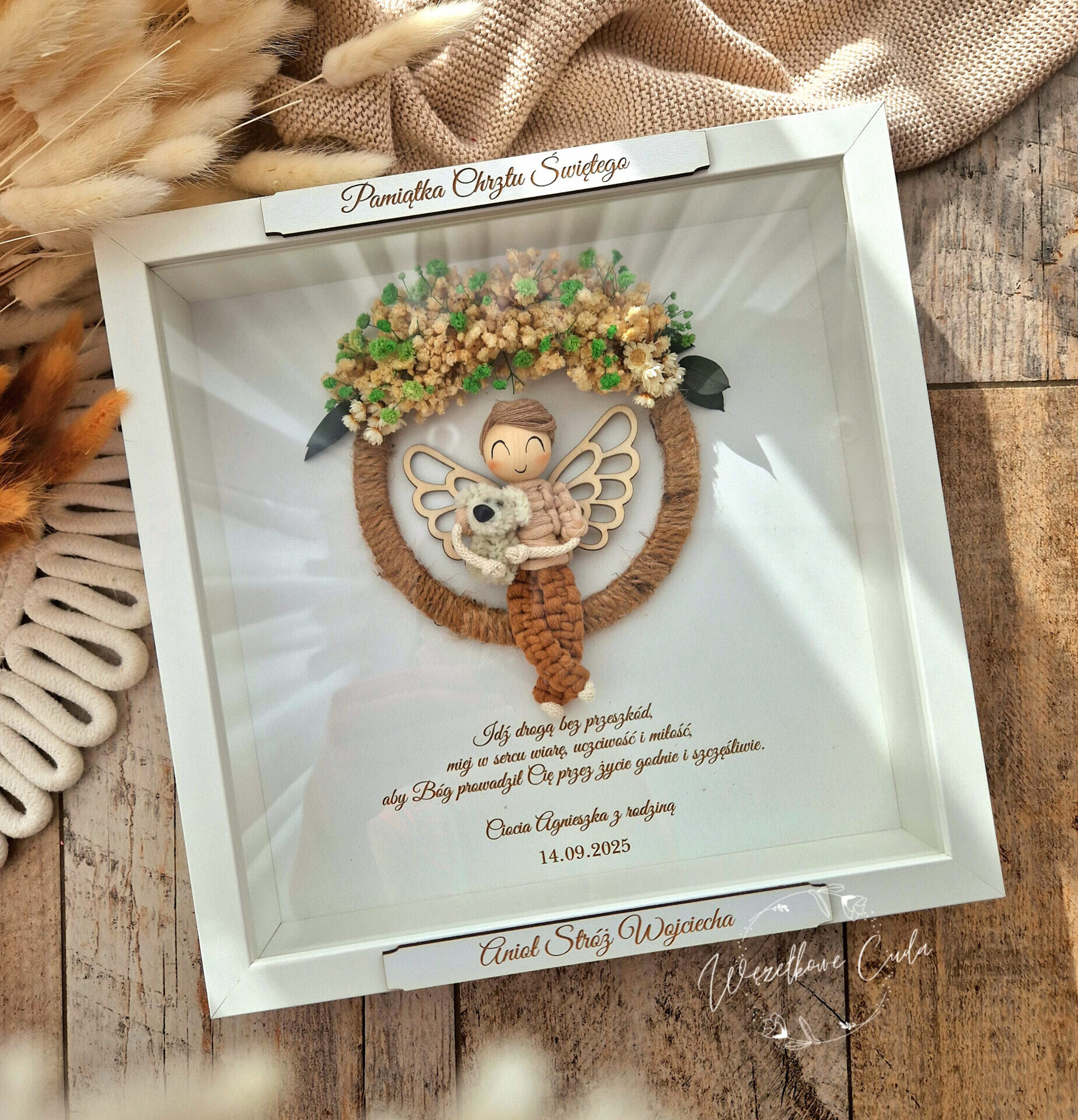 Szukasz pamiątki, która będzie czymś więcej niż tylko dekoracją? Wyjątkowa kompozycja w ramce 3D to wzruszający symbol wiary, miłości i opieki, idealny na Chrzest Święty. To prezent, który niesie ze sobą głębokie przesłanie na całe życie.