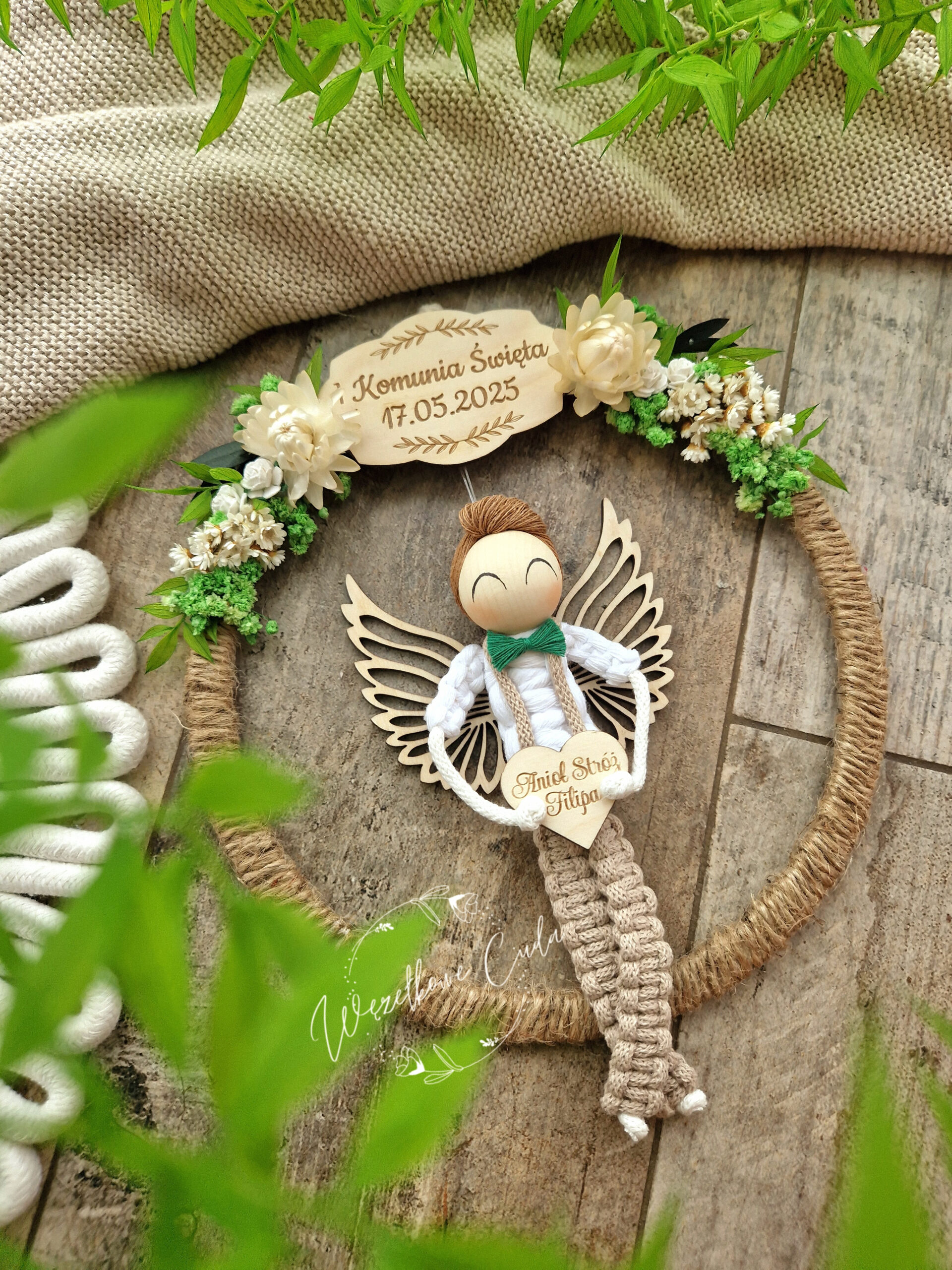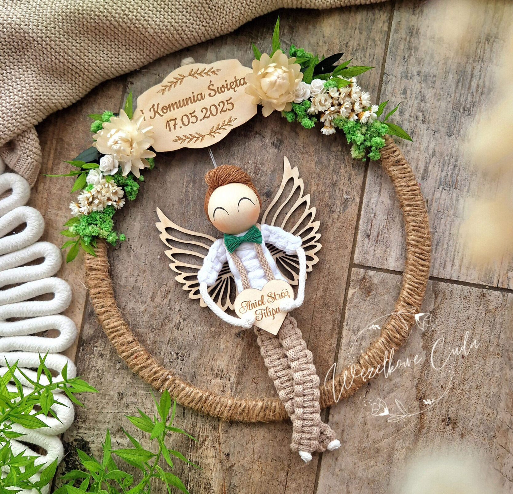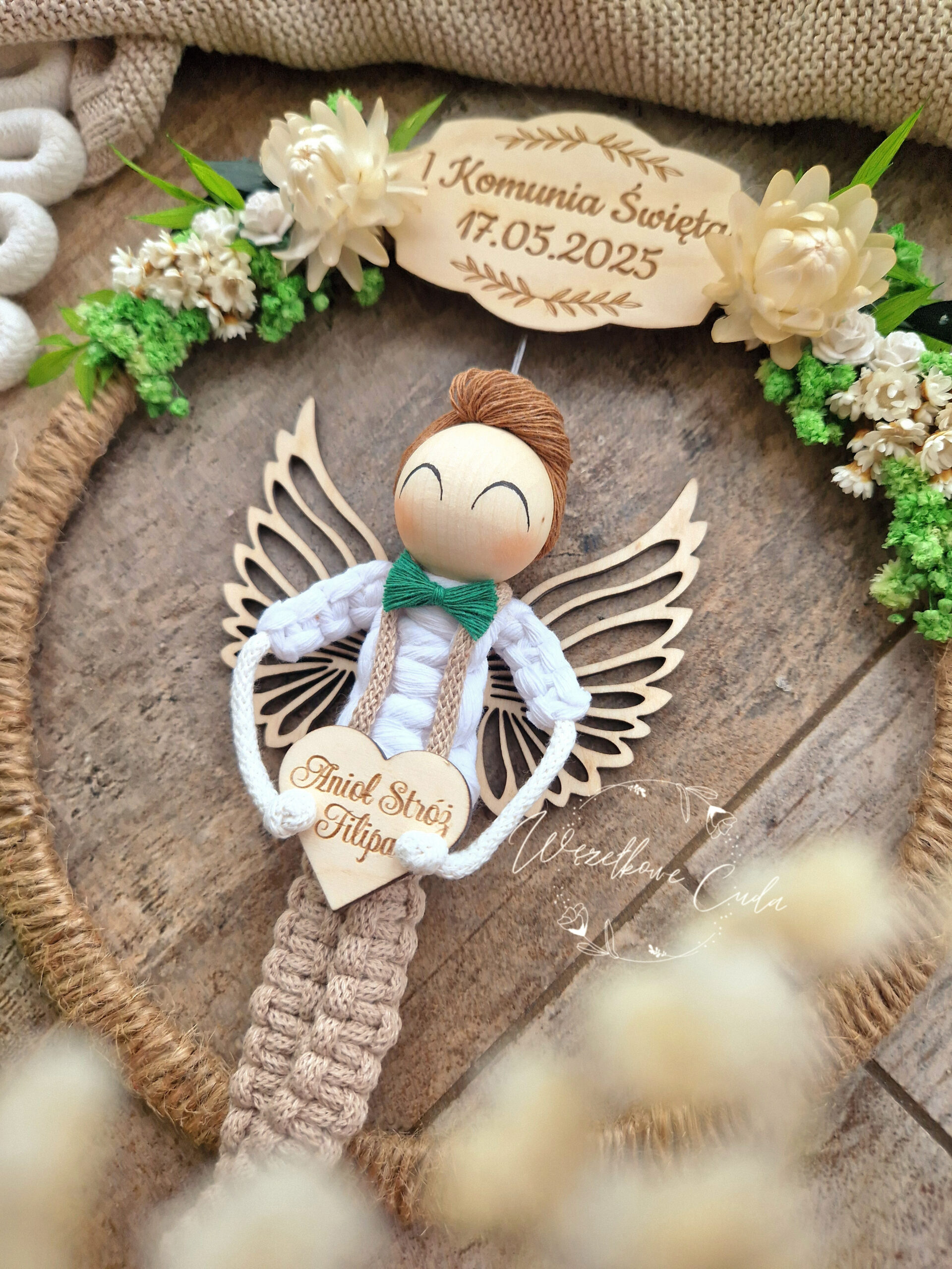 Piękna, ręcznie robiona dekoracja w formie obręczy z aniołkiem – idealna pamiątka z okazji Pierwszej Komunii Świętej lub Chrztu Świętego. Starannie wykonana z naturalnych materiałów: sznurka jutowego, drewna oraz ozdobnych kwiatów.