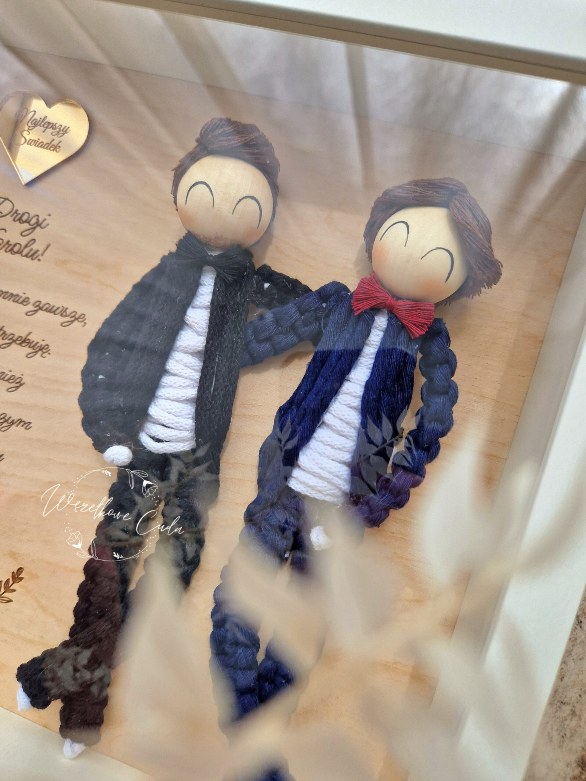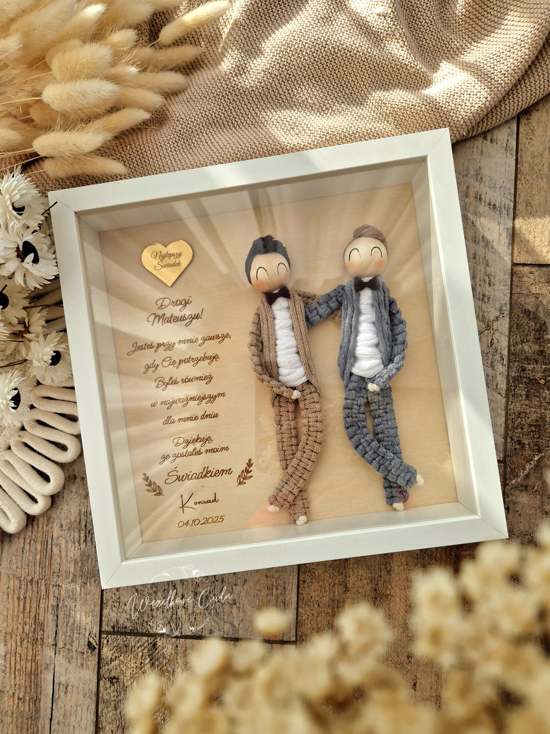 Podziękowanie ślubne dla świadka – ramka box, makramowe laleczki