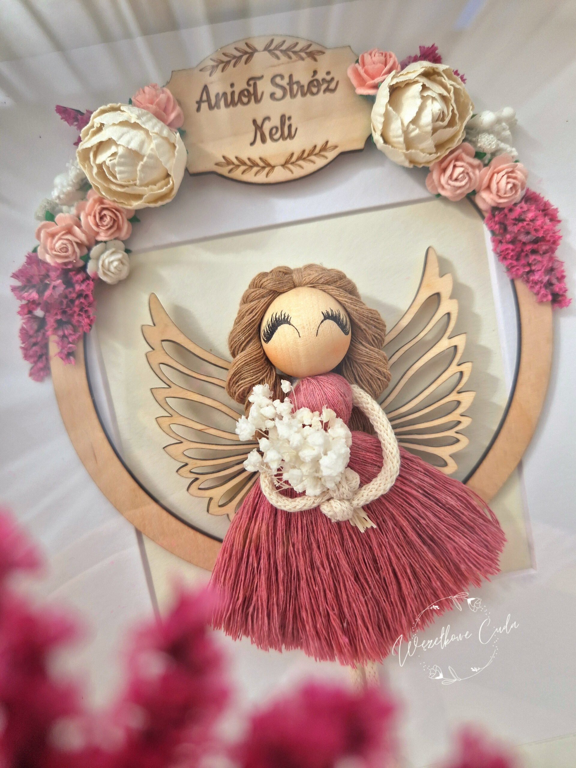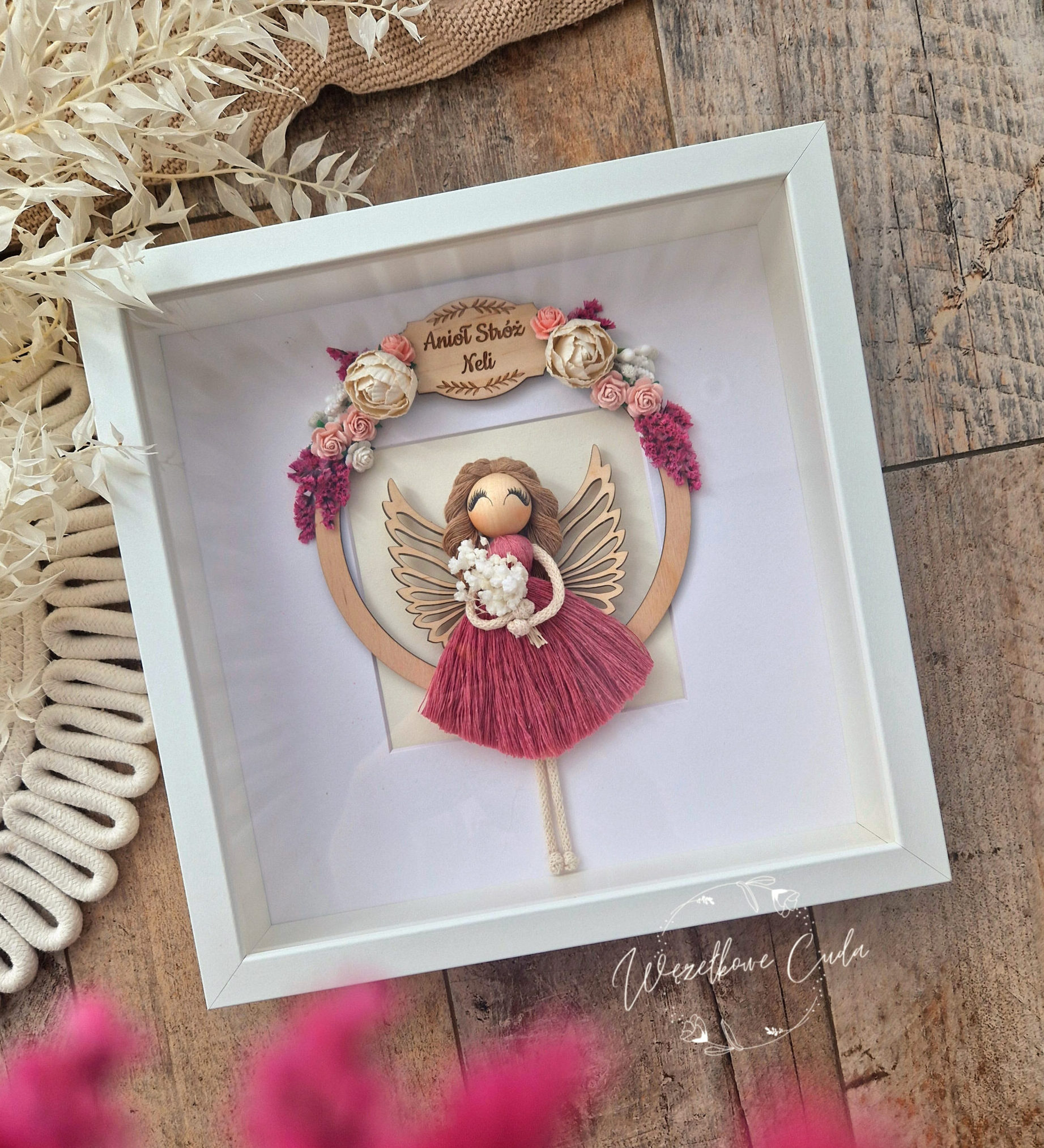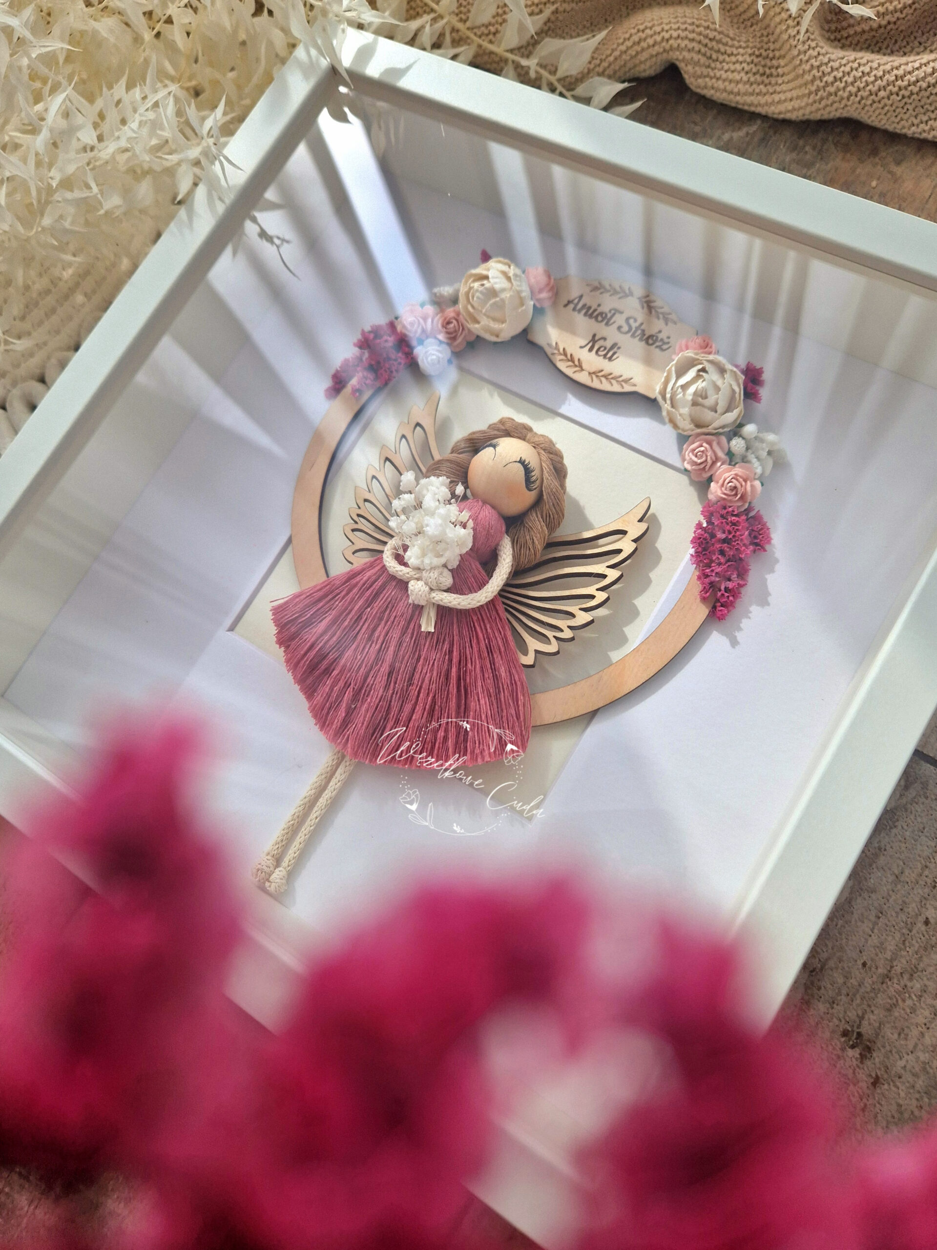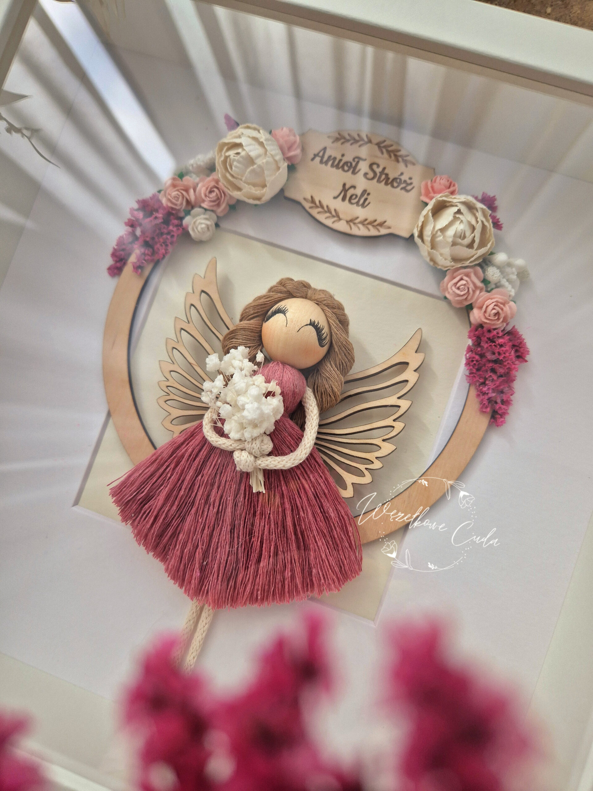 Ręcznie wykonany Anioł Stróż – magiczny, przestrzenny obraz w eleganckiej białej ramce, stworzony, by strzec i przypominać o najważniejszych chwilach w życiu dziecka. To idealny upominek, który łączy w sobie duchową symbolikę z urokiem delikatnego rękodzieła.