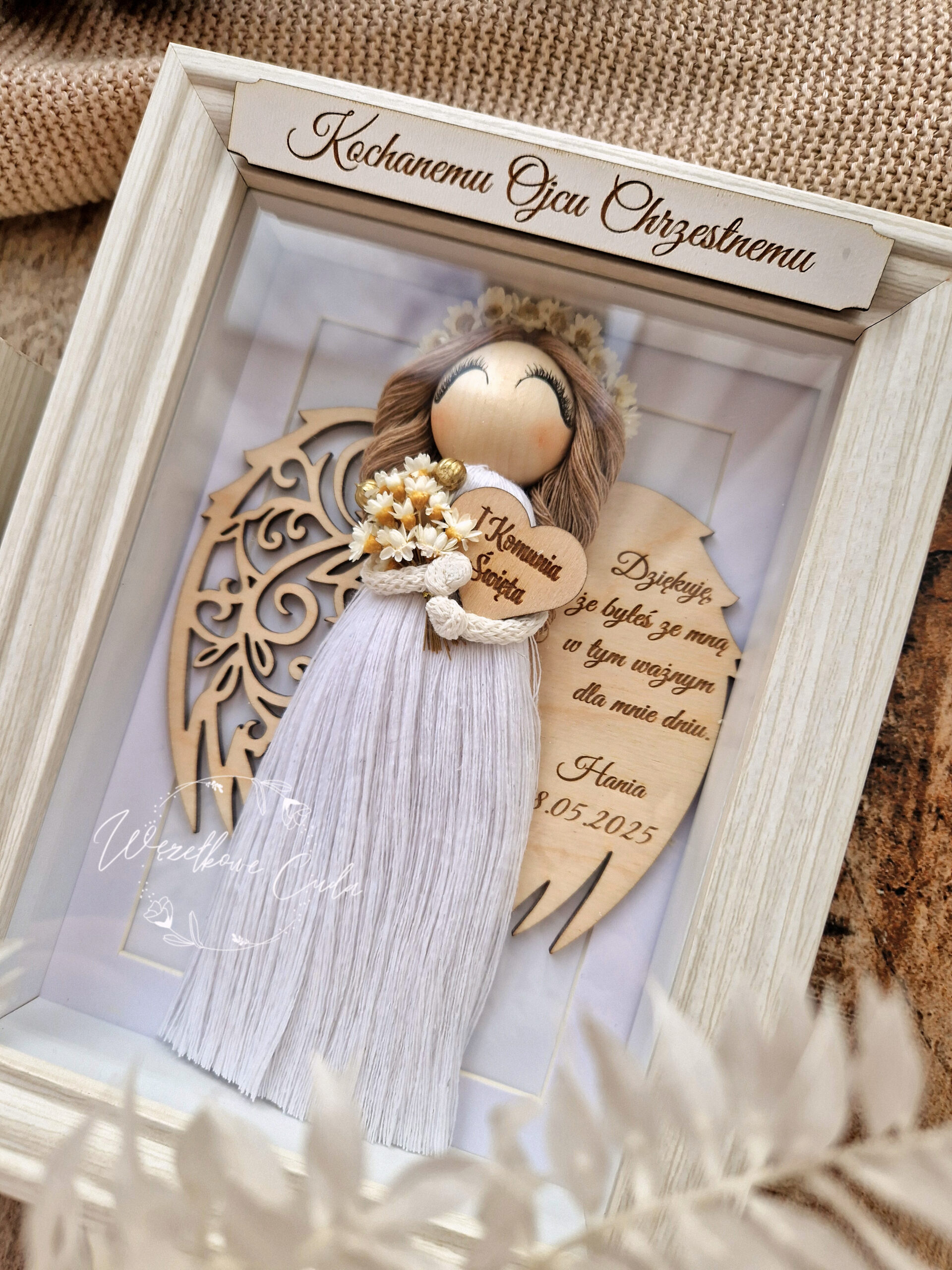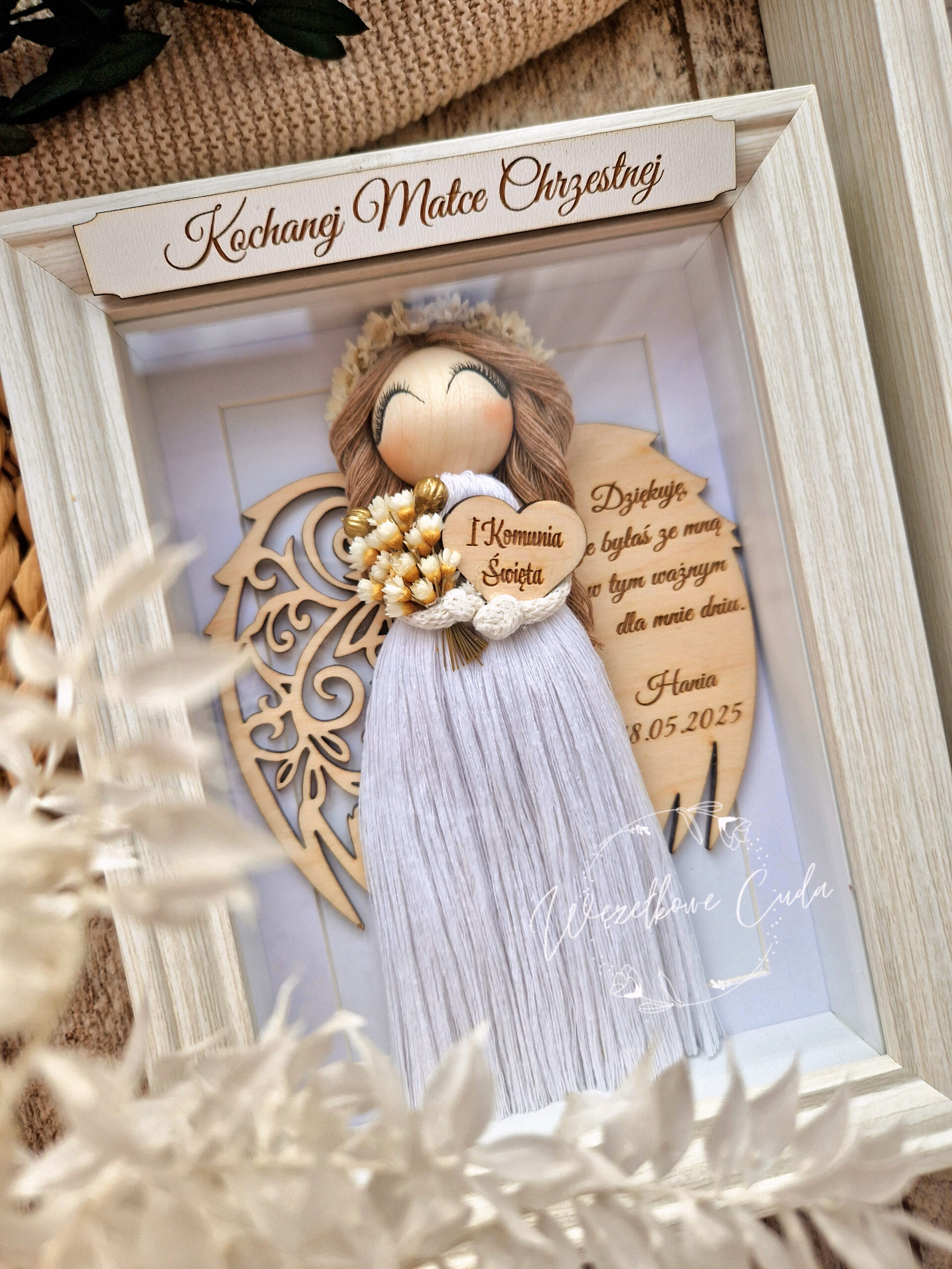 • Naturalne materiały – całość oprawiona jest w białą ramkę, a dekoracje zostały dobrane z uwzględnieniem naturalnych akcentów, takich jak bawełniany sznurek oraz suszone kwiatki, które dodają kompozycji ciepła i naturalnego charakteru.