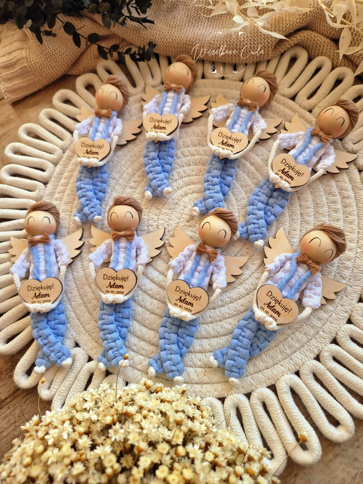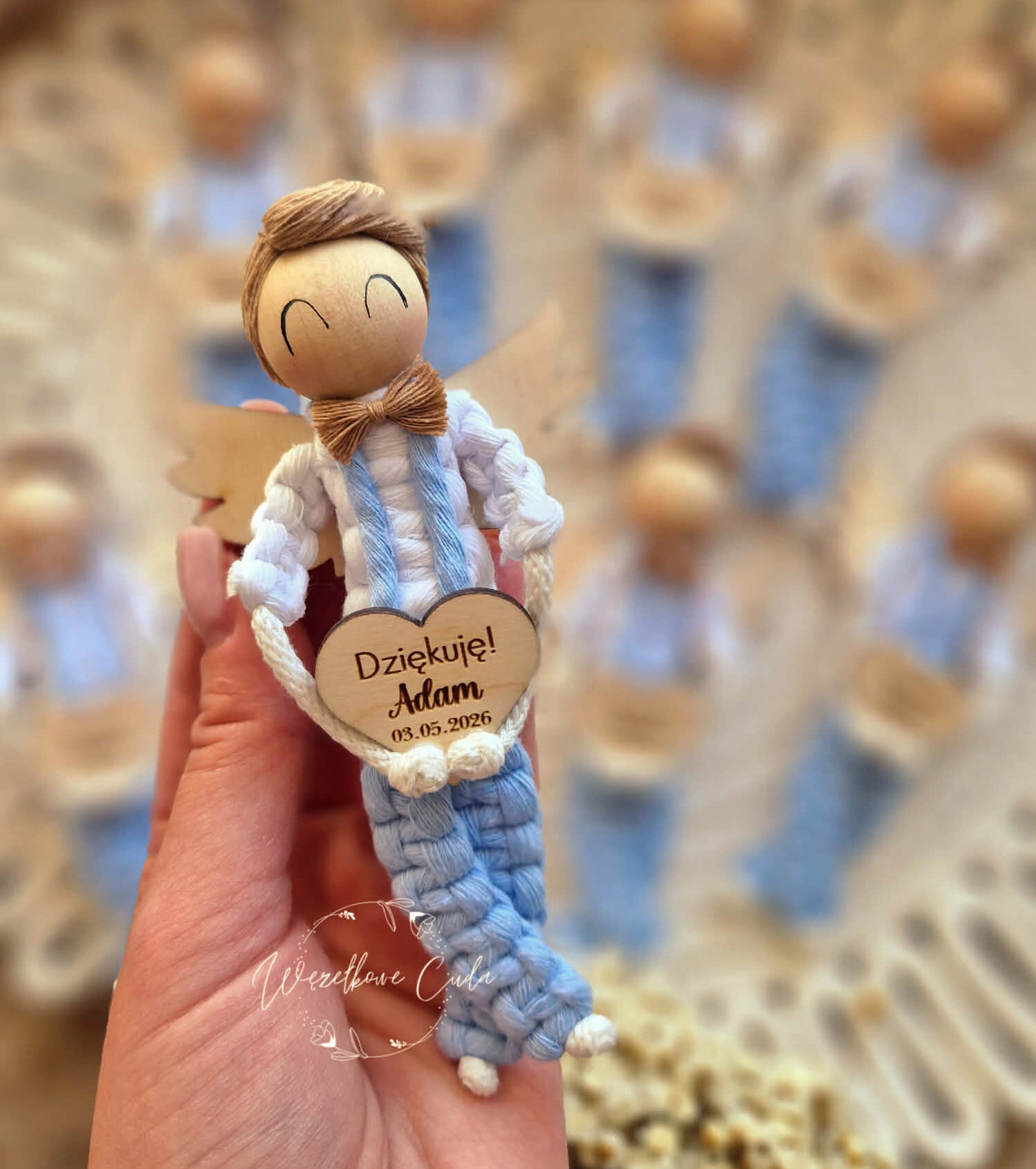 Wyjątkowe podziękowanie komunijne w formie ręcznie wykonanego aniołka z makramy, zamkniętego w eleganckim, ozdobnym pudełku z okienkiem. Idealna pamiątka dla gości, którzy towarzyszyli dziecku w tym ważnym dniu.
