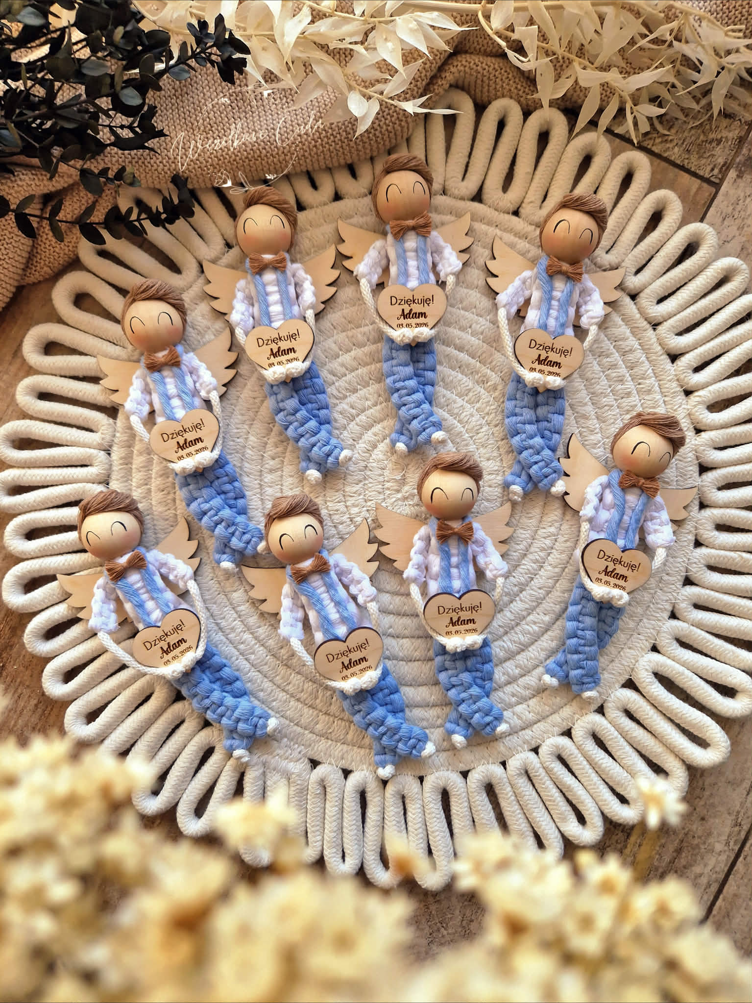 • Naturalne materiały – aniołek ze sznurka bawełnianego, drewniane skrzydełka oraz serduszko z grawerem to wyjątkowo subtelne połączenie, które idealnie dopasuje się do delikatnego stylu uroczystości.