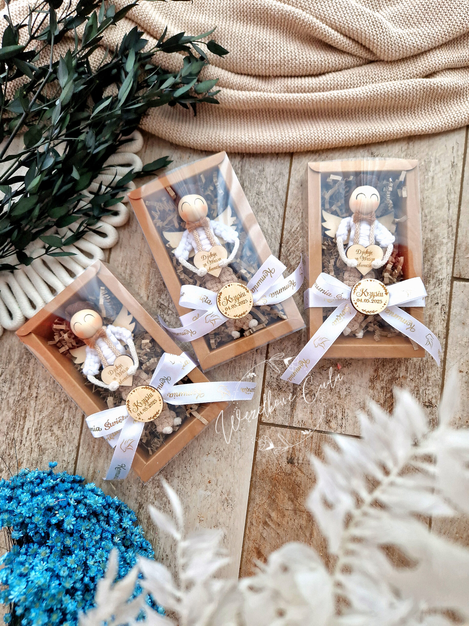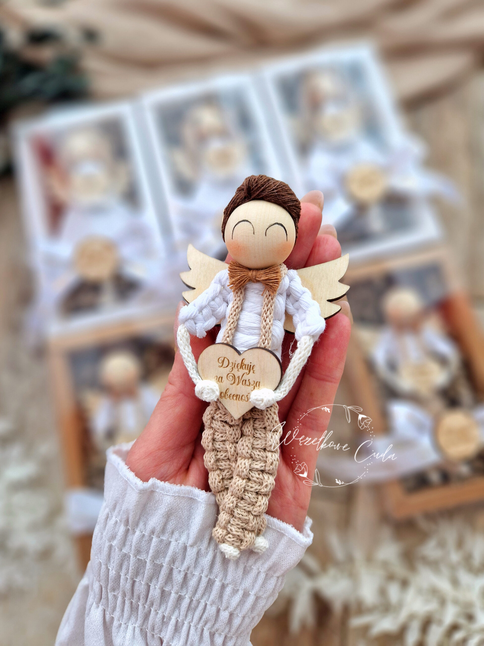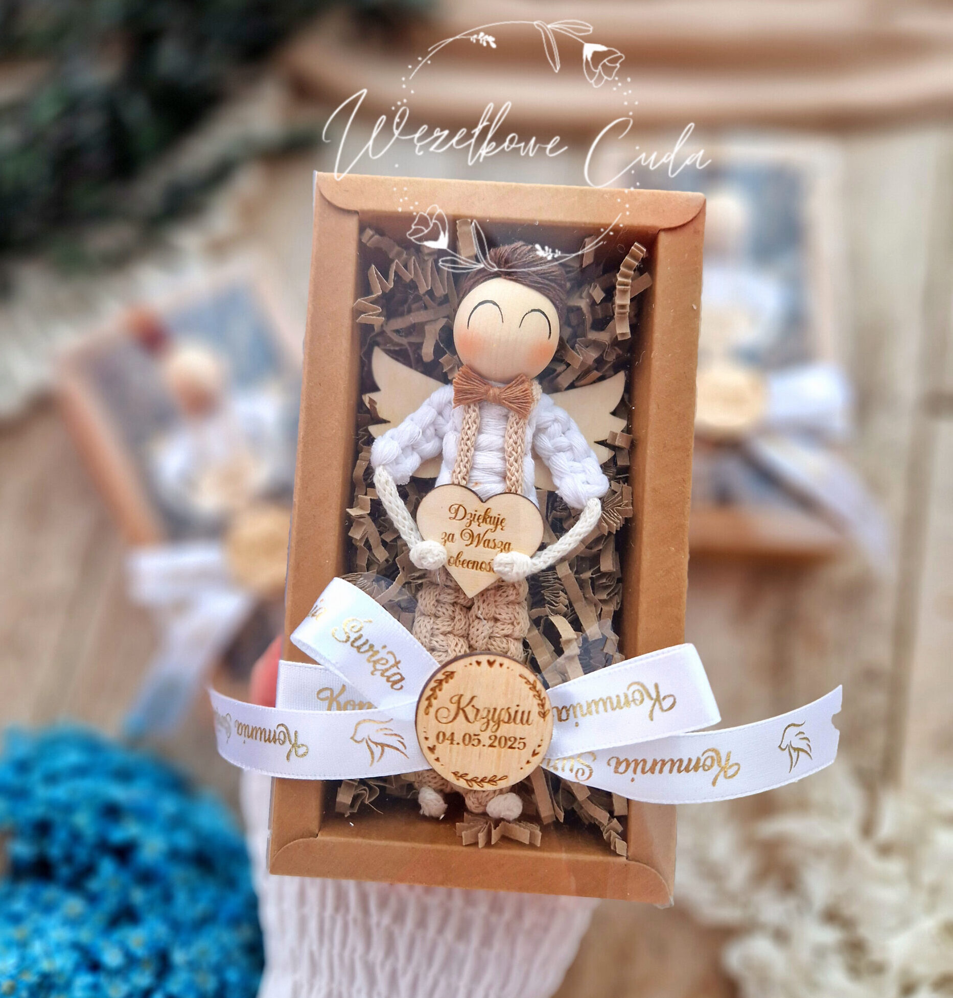 Wyjątkowe podziękowanie komunijne w formie ręcznie wykonanego aniołka z makramy, zamkniętego w eleganckim, ozdobnym pudełku z okienkiem. Idealna pamiątka dla gości, którzy towarzyszyli dziecku w tym ważnym dniu.