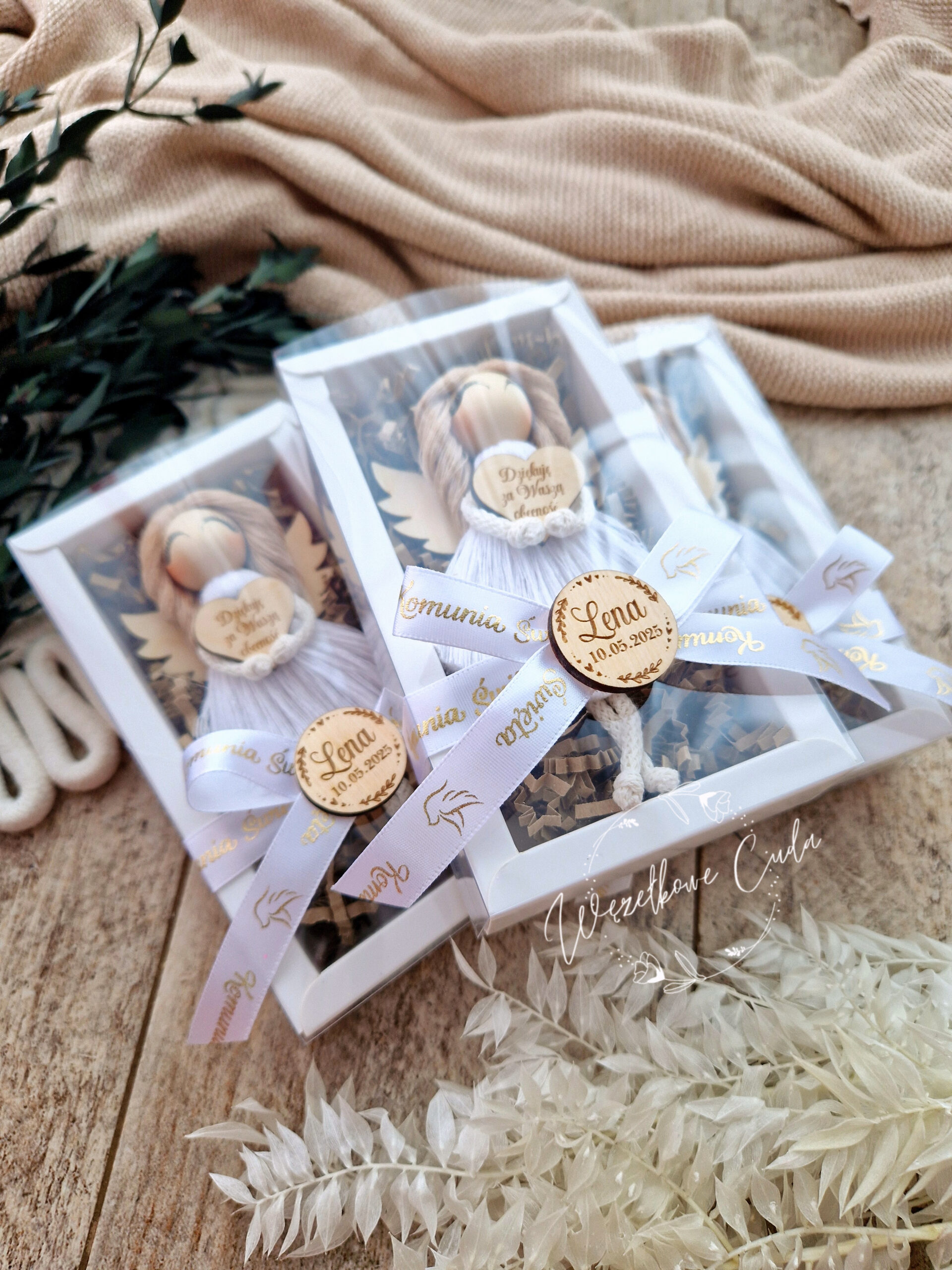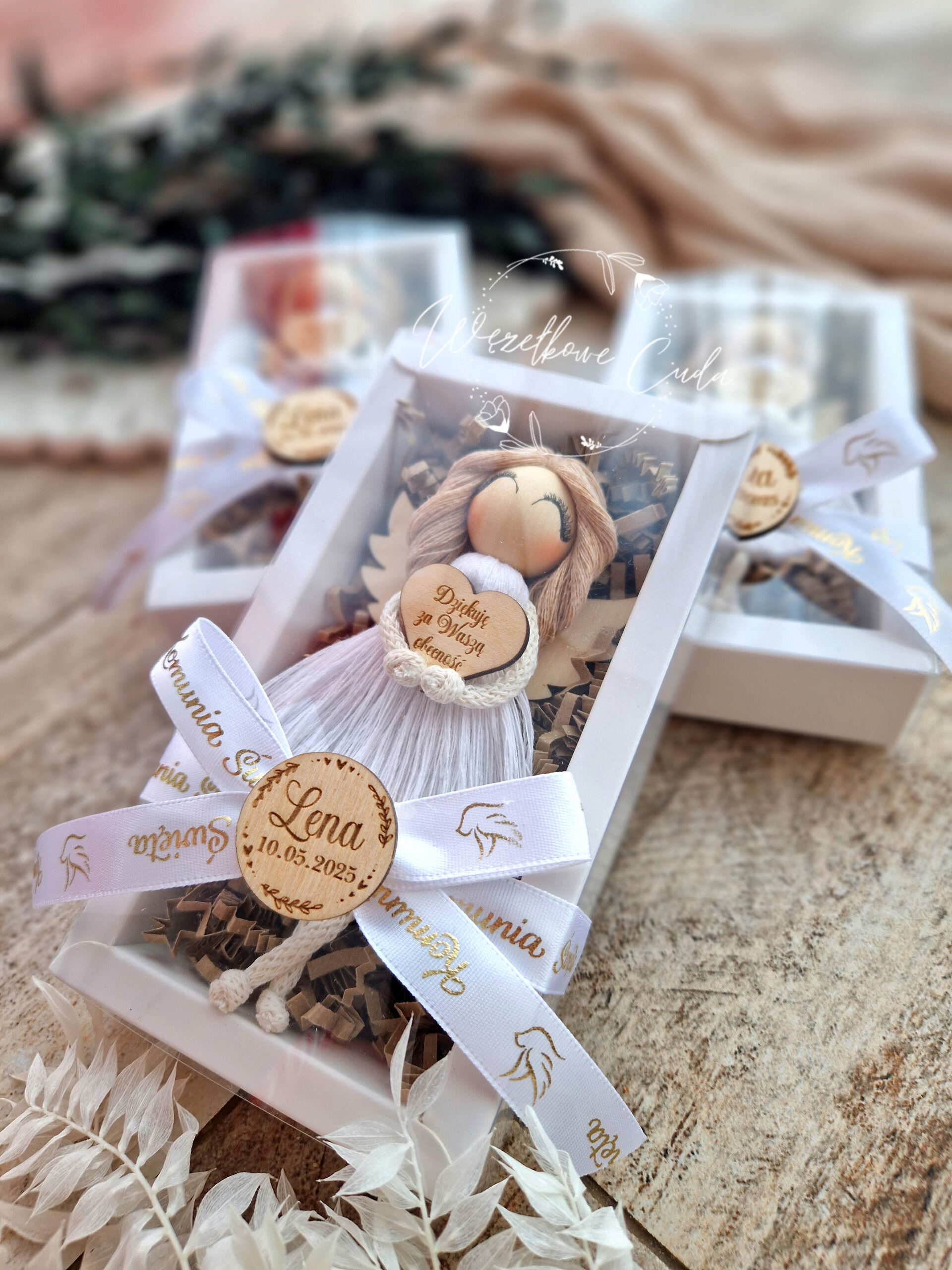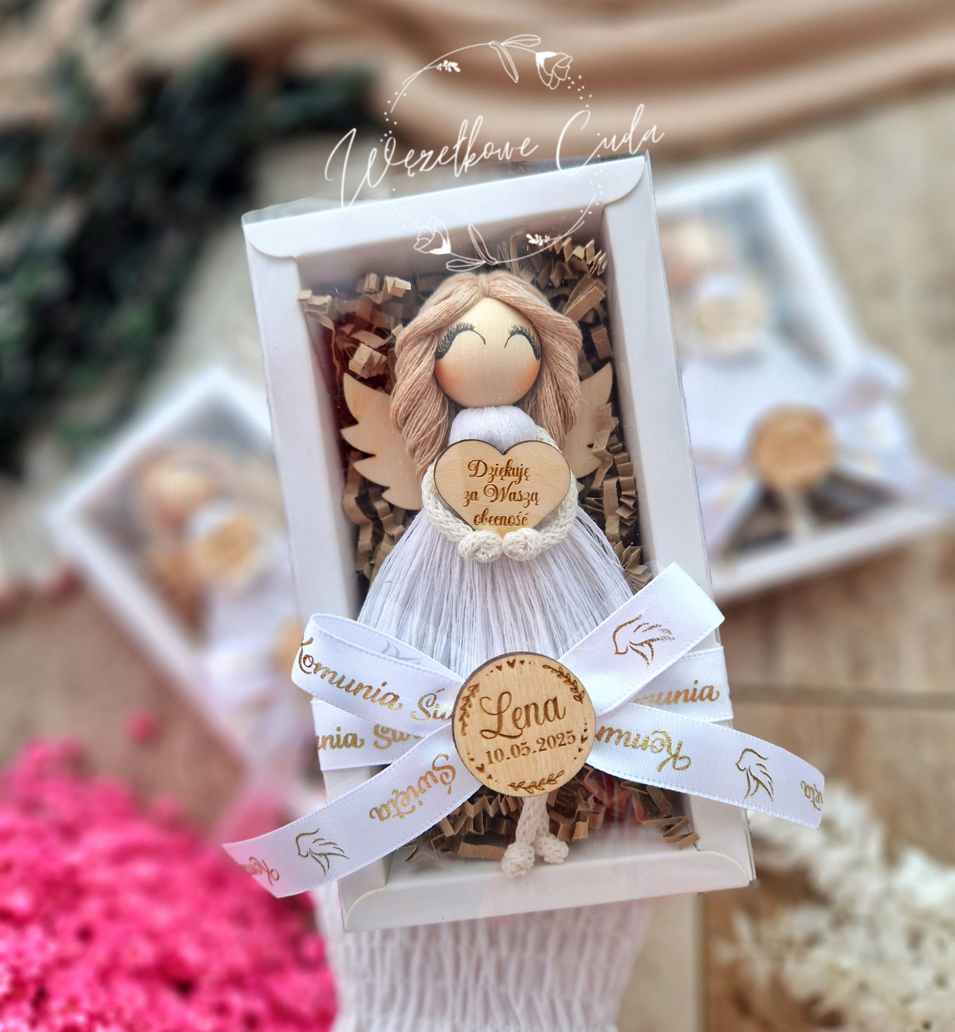 Wyjątkowe podziękowanie komunijne w formie ręcznie wykonanego aniołka z makramy, zamkniętego w eleganckim, ozdobnym pudełku z okienkiem. Idealna pamiątka dla gości, którzy towarzyszyli dziecku w tym ważnym dniu.