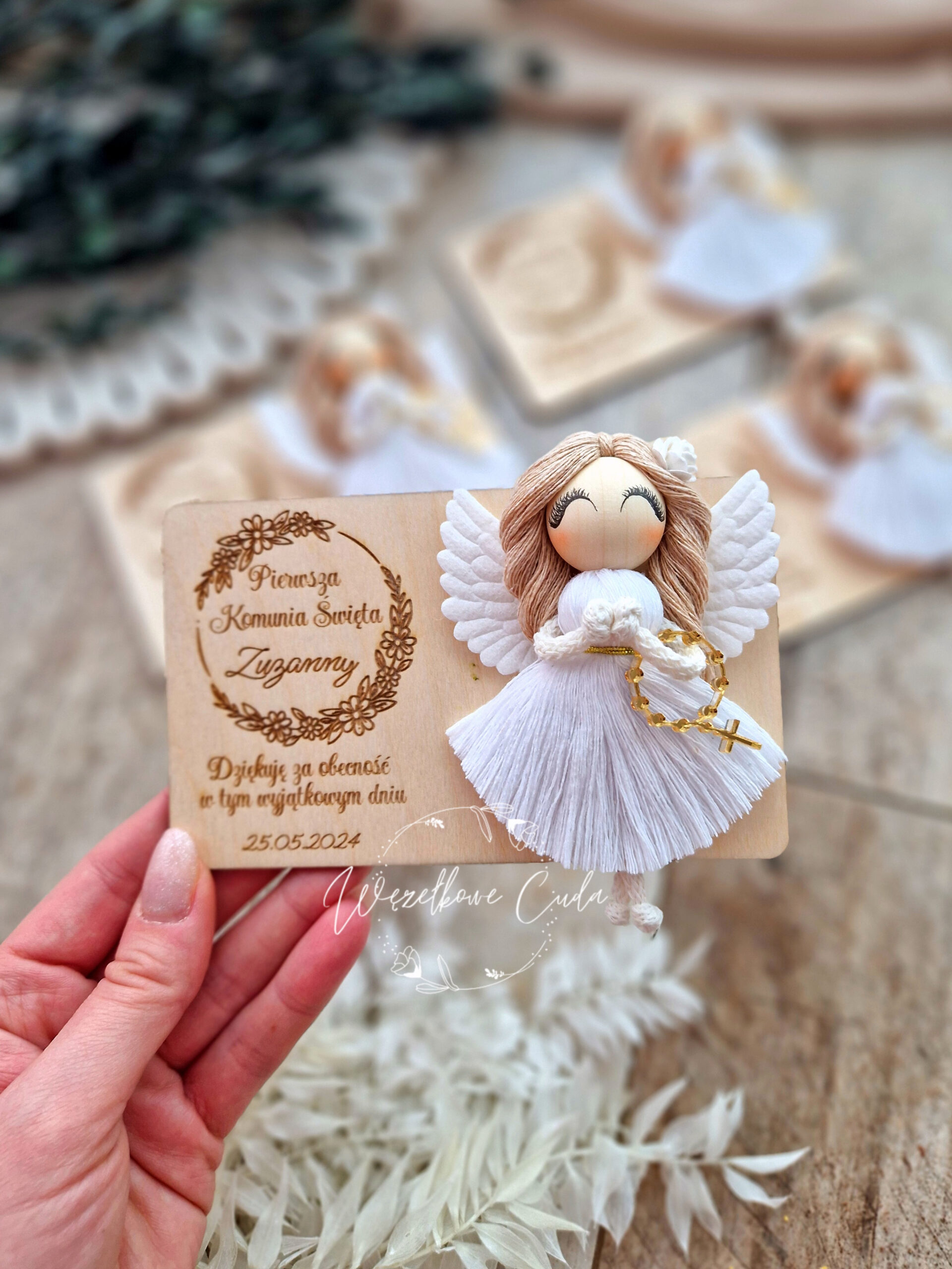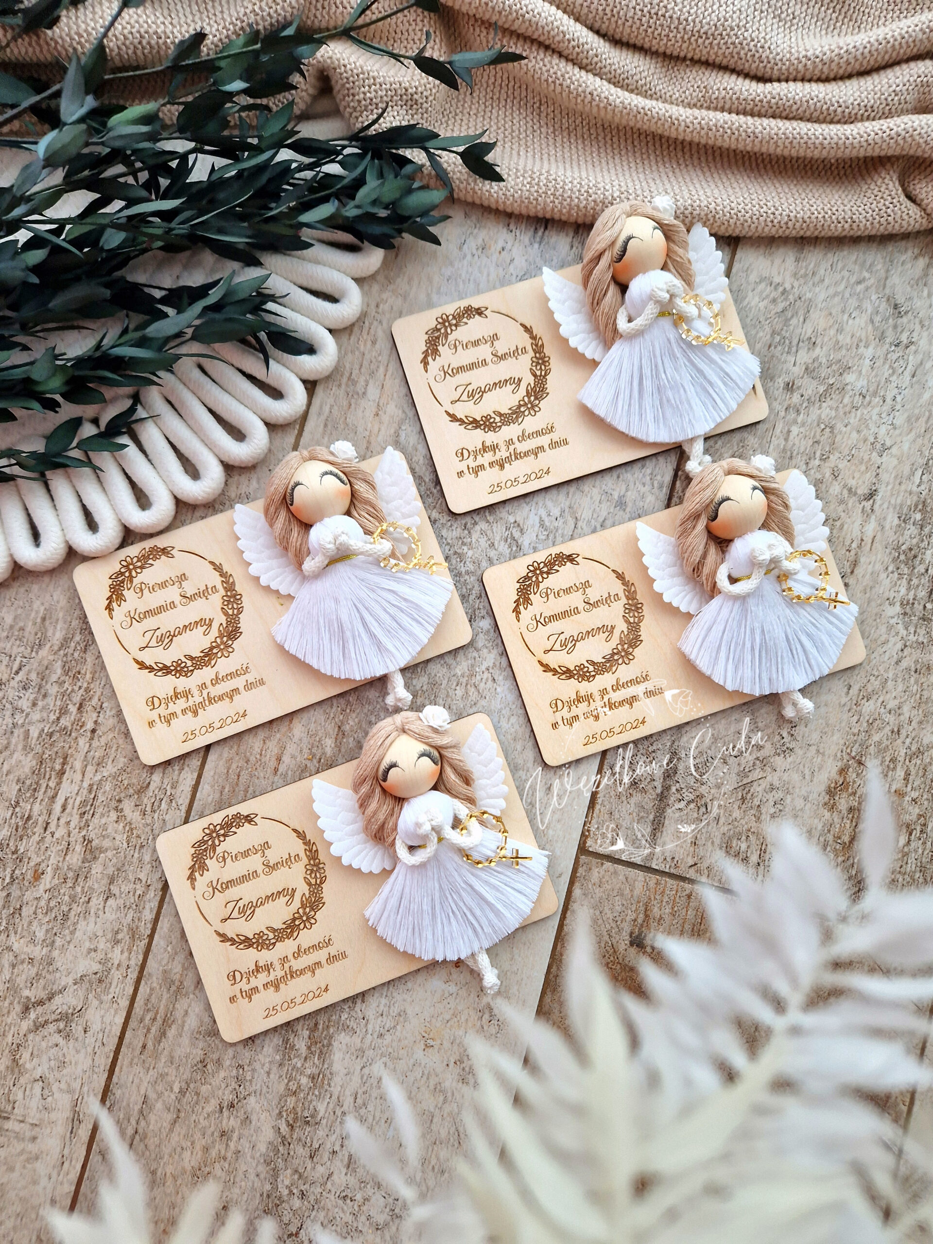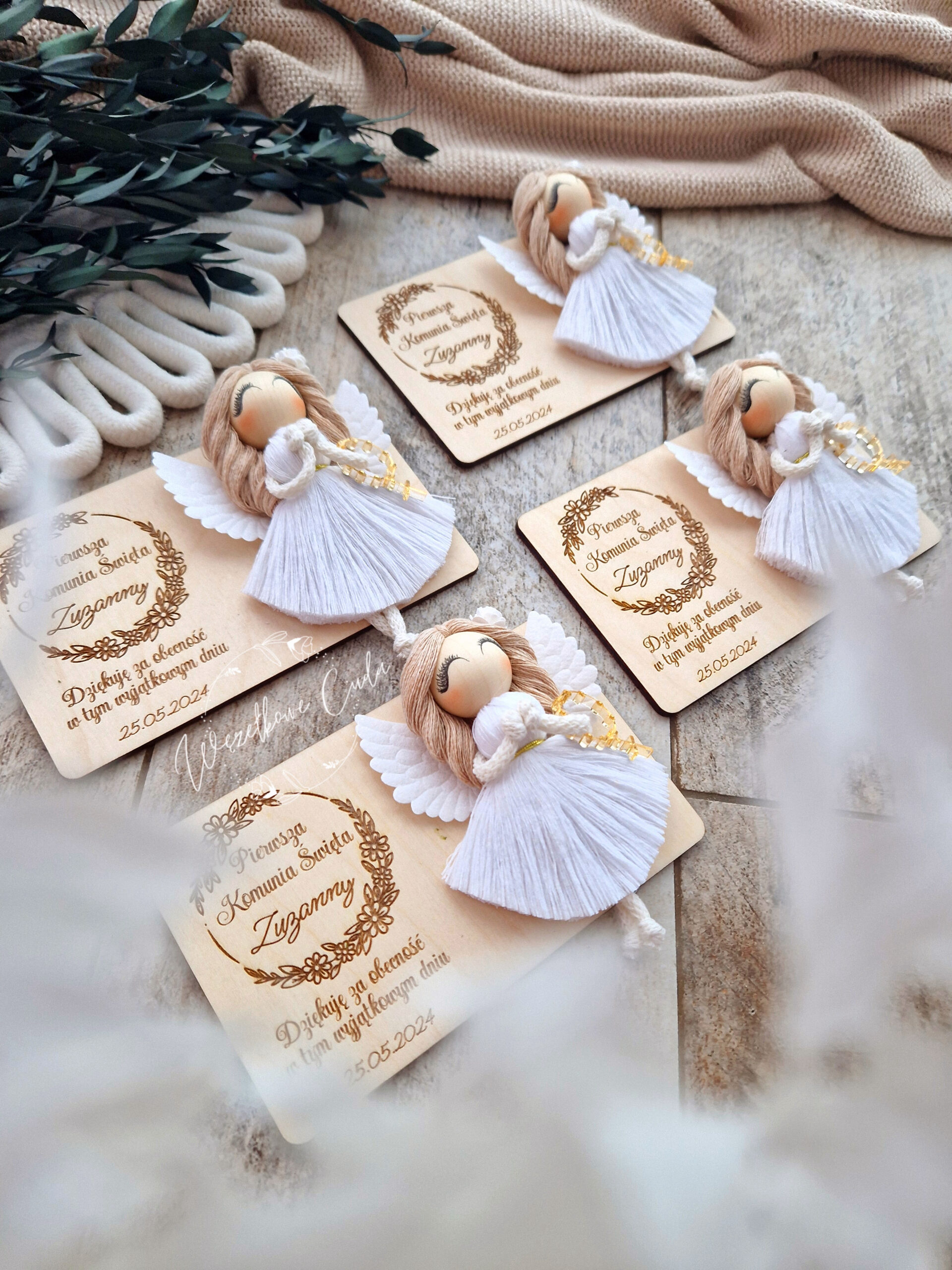 • Naturalne materiały – drewniana tabliczka z jasnego drewna z magnesem na odwrocie oraz aniołek ze sznurka bawełnianego to wyjątkowo subtelne połączenie, które idealnie dopasuje się do delikatnego stylu uroczystości.
