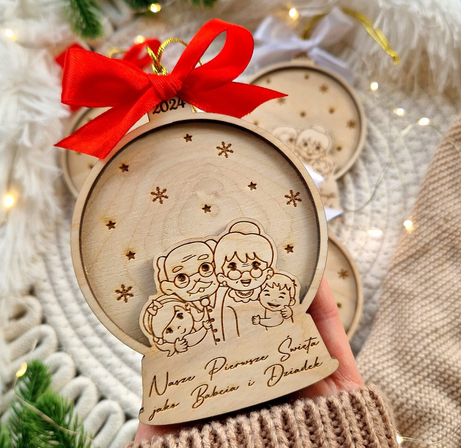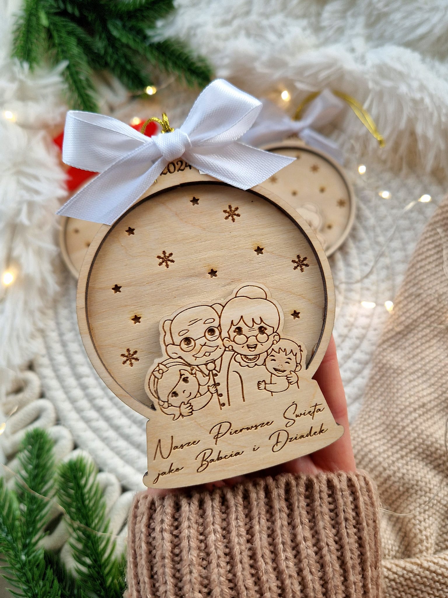 Uchwyć magię pierwszych wspólnych Świąt jako dziadkowie dzięki tej wyjątkowej, drewnianej ozdobie świątecznej. Starannie wykonana z naturalnego drewna, ozdoba przedstawia uroczy grawer przedstawiający mamę, tatę i maluszka w ramionach – symbol ciepła, miłości i rodzinnej bliskości.