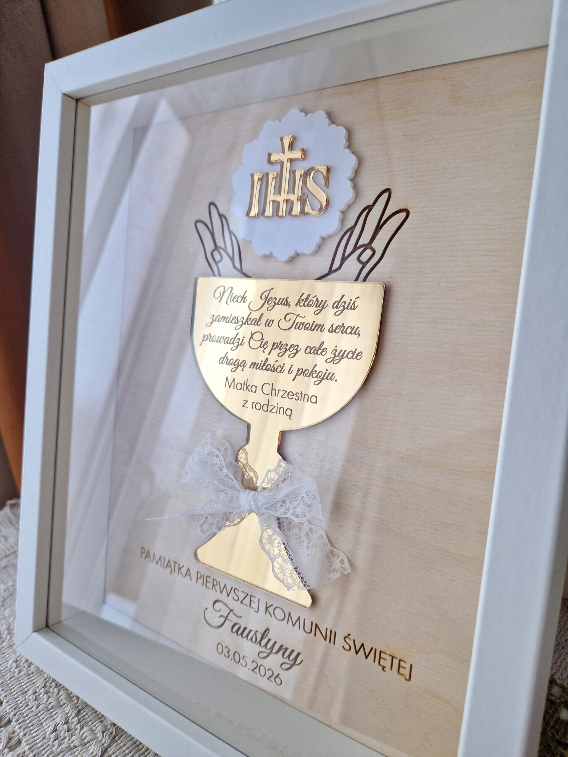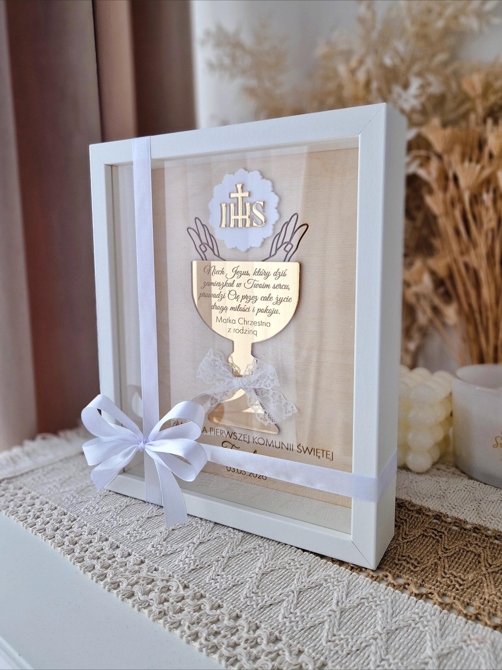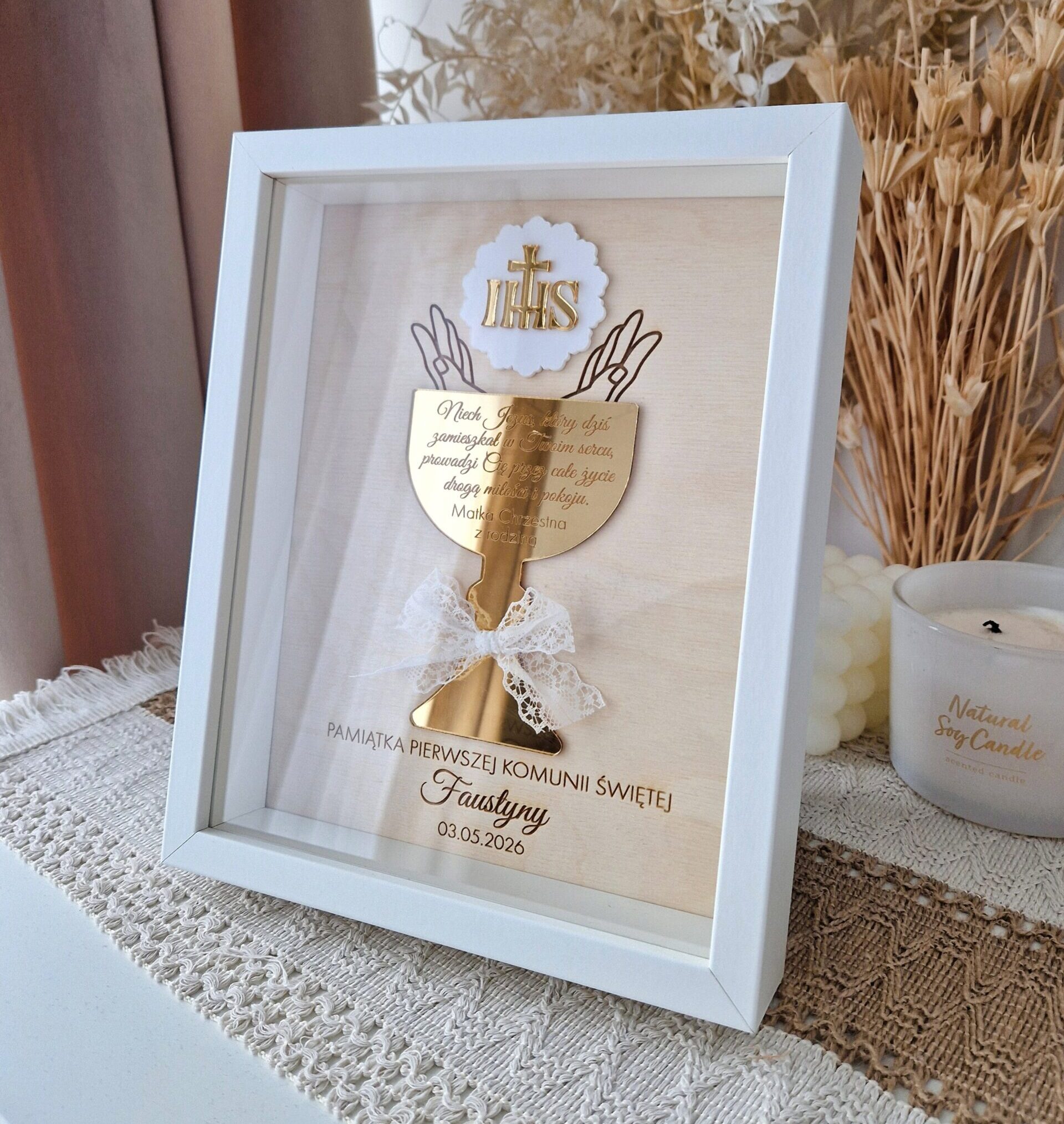 Wyjątkowy i elegancki prezent z okazji Pierwszej Komunii Świętej. Personalizowana pamiątka w ramce to doskonały wybór, który na długo pozostanie pięknym wspomnieniem tego niezwykłego dnia.